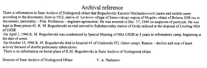 Kazimierz Boguszewski syn Anny Boguszewskiej – po wkroczeniu armii sowieckiej do Brześcia, aresztowany w 1944r przez NKWD, a następnie wywieziony na tereny ZSRR do miejscowości Suchobezwodnyji w okolicach Gorki. W obozie skazany przez sąd na 5 lat ciężkich robót, zmarł w 1947 r. Poniżej list od dyrektora Archiwum z Gorki (Rosja) , dotyczący okoliczności śmierci Kazimierza Boguszewskiego.